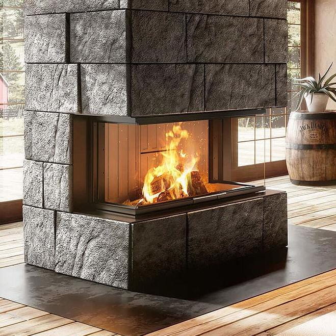 - Arte — модели с вытянутым по высоте стеклом. Вертикальный формат позволит в полной мере насладиться красотой горения. Максимальная мощность топок в диапазоне от 8.3 до 16.9 кВт. Возможны следующие варианты стекла: привычное фронтальное, двухстороннее или же трёхстороннее. Фронтальное стекло трёхсторонних топок может быть широким (такие модели лучше располагать у стены) или узким, но с длинными боковыми стёклами, что отлично подойдёт для завершения межкомнатной перегородки. Дверца всегда оснащена подъёмным механизмом.
