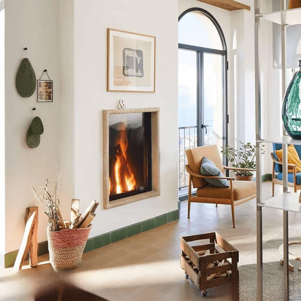 - Arte — модели с вытянутым по высоте стеклом. Вертикальный формат позволит в полной мере насладиться красотой горения. Максимальная мощность топок в диапазоне от 8.3 до 16.9 кВт. Возможны следующие варианты стекла: привычное фронтальное, двухстороннее или же трёхстороннее. Фронтальное стекло трёхсторонних топок может быть широким (такие модели лучше располагать у стены) или узким, но с длинными боковыми стёклами, что отлично подойдёт для завершения межкомнатной перегородки. Дверца всегда оснащена подъёмным механизмом.