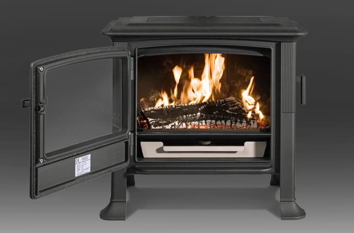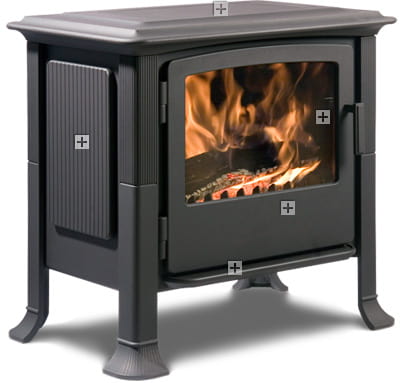 Очаг прямоугольной формы, лучшее расположение печи — у стены. Дверца снабжена прямым жаропрочным стеклом (293 x 448 мм). Топка также выполнена из чугуна. На верхней панели размещена варочная поверхность, которую можно использовать для приготовления пищи или разогрева напитков. В модели предусмотрена возможность притока воздуха извне.