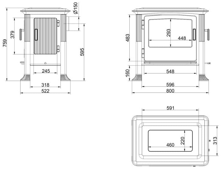 В конструкции предусмотрена дополнительная боковая дверь, облегчающая загрузку топлива. Дымоход диаметром 150 мм подключается сзади.