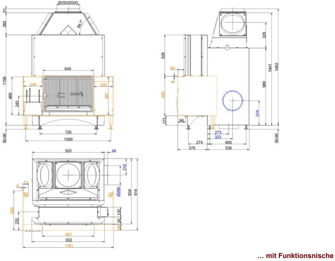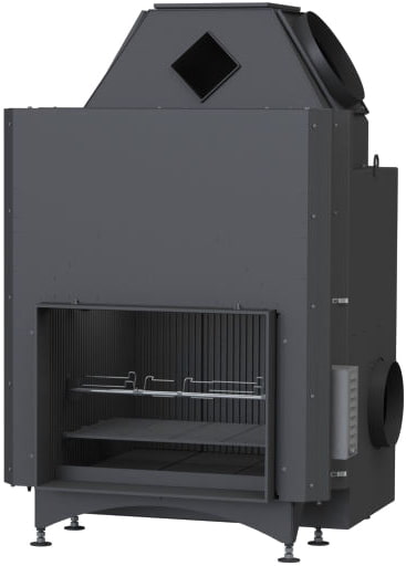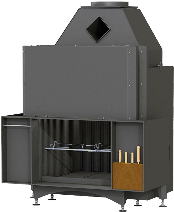 Топочная камера футерована чёрным чугуном с рифлёной текстурой. В комплекте идёт подставка для гриля с новой чугунной решёткой. Модель с подовой (безколосниковой) системой горения. Очаг с возможностью притока воздуха извне. Для отвода продуктов сгорания необходим дымоход диаметром 300 мм.