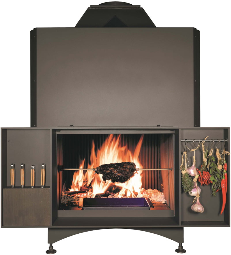 Модель для тех, кому важнее по-настоящему ощущать огонь, а не отапливать комнату долгое время. Устройство со стальным корпусом и открытой конструкцией, без стекла. Данная версия предназначена для приготовления блюд на огне. У топки прямой проём для обзора на горение. Для безопасной работы предусмотрен выдвижной искрозащитный кожух, обрамлением вокруг него выступает монтажная рама чёрного цвета. Ширина проёма — 645 мм, высота — 489 мм.