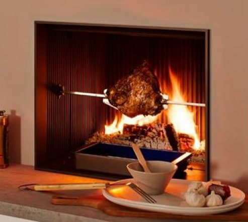 - Прямой проём — одна фронтальная сторона топки, лучшее размещение — у стены. Некоторые модели могут снабжаться модулем для приготовления мяса, рыбы или овощей на открытом огне.