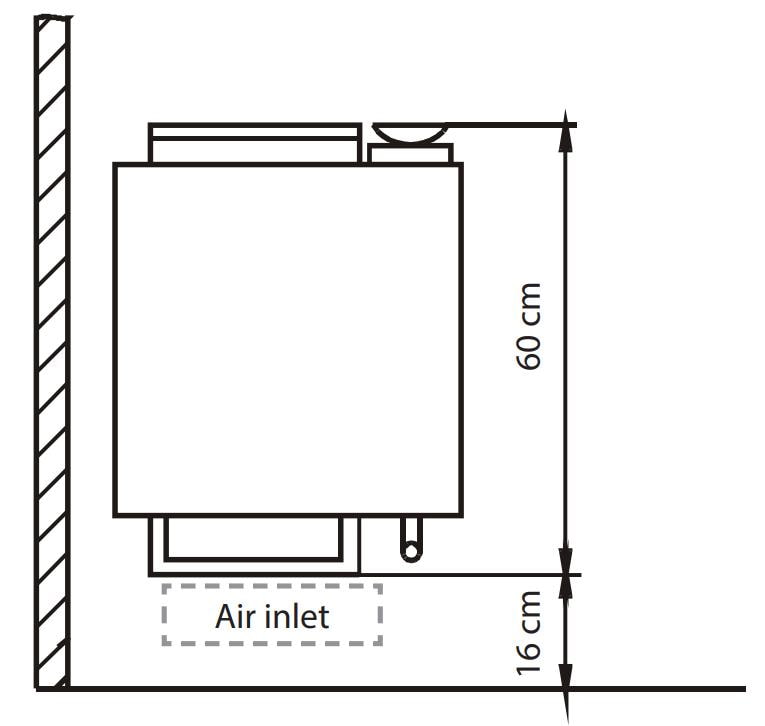 Устройство с настенным расположением. Корпус имеет прямоугольную форму, внутренняя часть из нержавеющей стали. Кожух может быть окрашен в цвет антрацит или выполнен из нержавеющей стали. Верхняя крышка печи выполнена из алюминия. Каменка вмещает 15 кг камней.