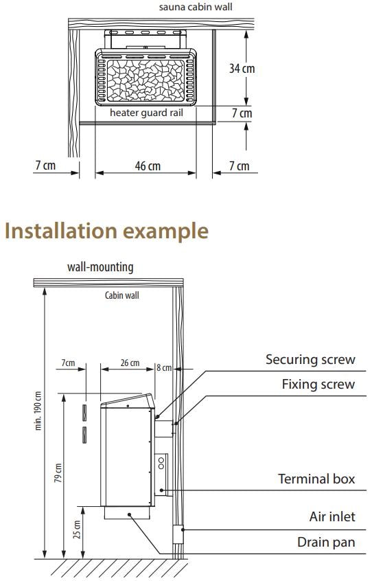 Устройство с настенным расположением, однако возможна установка на пол при покупке опциональных ножек. Корпус имеет прямоугольную форму, изготовлен из нержавеющей стали. Верхняя крышка печи выполнена из чугуна. Каменка вмещает 15 кг камней.