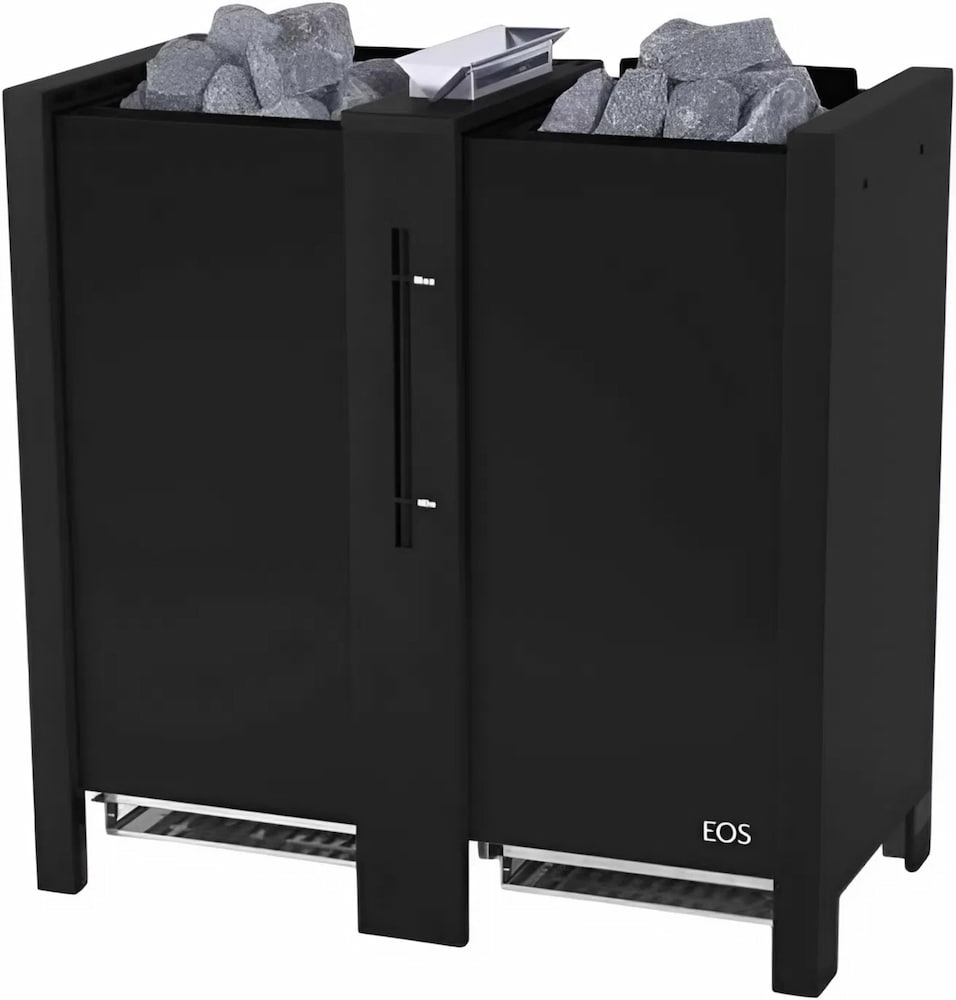 Устройство с напольным расположением. Корпус имеет прямоугольную форму, изготовлен из нержавеющей стали и окрашен в цвет антрацит или черный. В модели с антрацитовой покраской фронтальные панели выполнены из матовой нержавеющей стали. Плоская задняя панель и встроенная клеммная коробка позволяют разместить печь в центре парной или перед фасадом из стекла. Две отдельные каменки вмещают 50 кг камней.