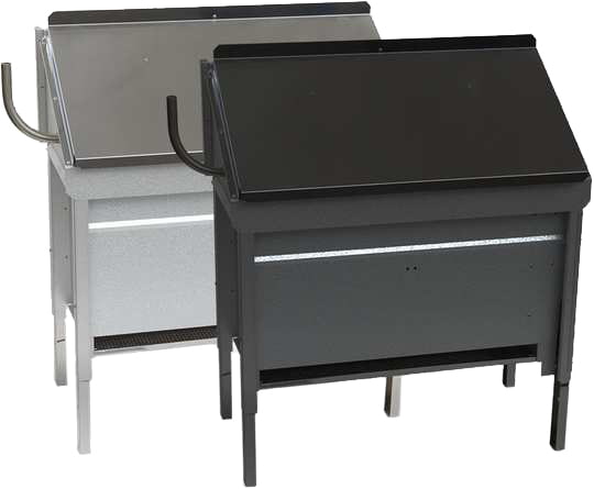 Устройство с напольным расположением. Корпус имеет прямоугольную форму со скошенной крышкой, изготовлен из нержавеющей стали и может быть окрашен в цвет антрацит. Ножки регулируются по высоте до 120 мм. Каменка вмещает 15 кг камней. В комплекте поставляется защитная решетка, предотвращающая попадание посторонних предметов.