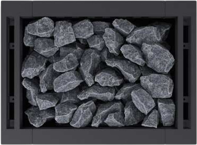Каменка вмещает 45 кг камней. Специально для данной серии изготавливаются цельные кубические камни для заполнения верхней части каменки.