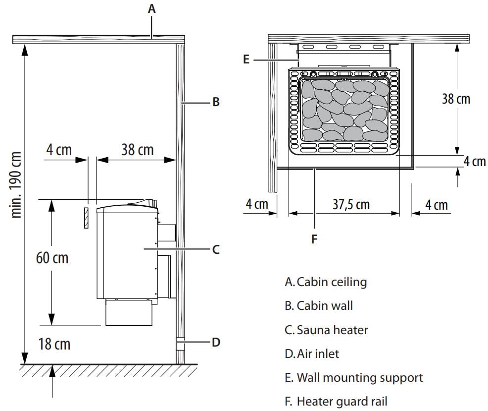 Устройство с настенным расположением. Корпус имеет прямоугольную форму, внутренняя часть из нержавеющей стали. Кожух окрашен в цвет антрацит. Верхняя крышка печи выполнена из алюминия. Каменка вмещает 15 кг камней.