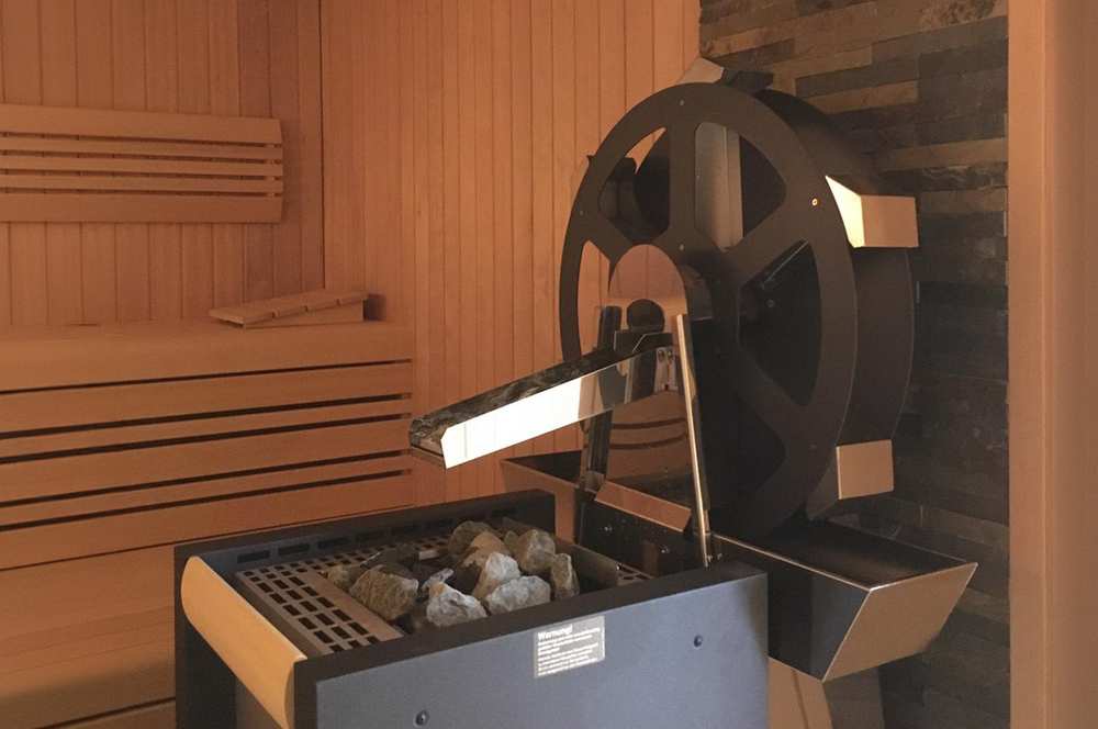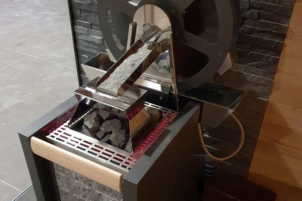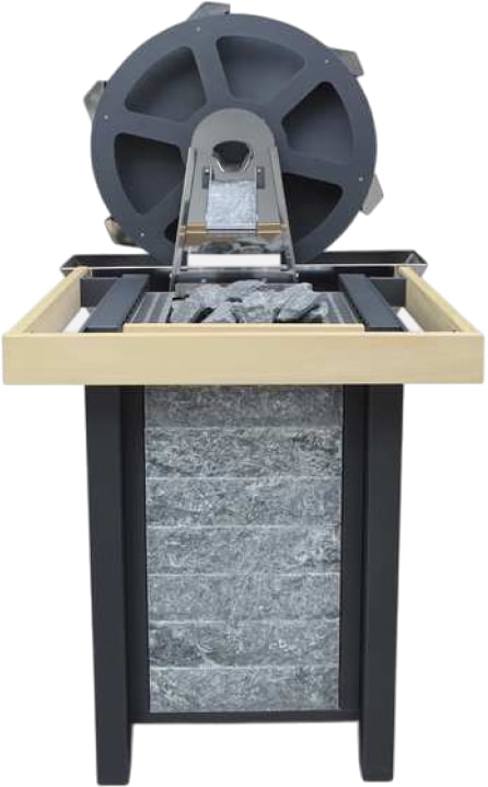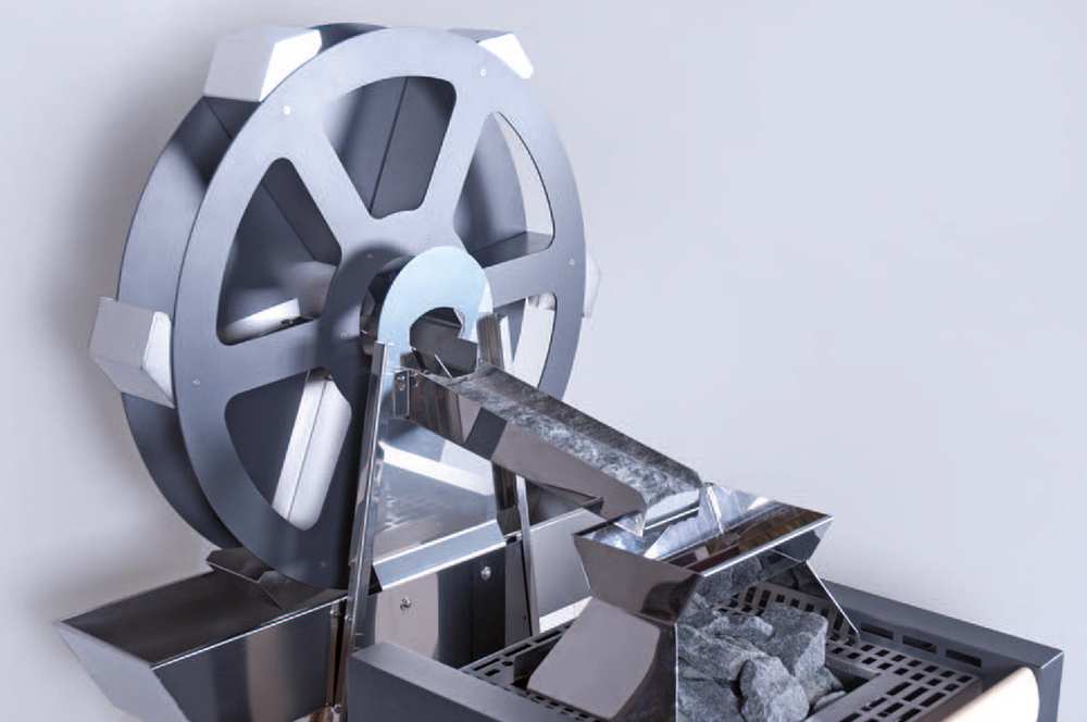 Принцип работы мельницы: колесо, оснащенное приводом, медленно вращается против часовой стрелки в режиме ожидания. После подачи сигнала начинается вращение в обратную сторону и происходит подача воды в специальный желоб каждые 30, 45 или 60 минут, после чего вода попадает на каскад, расположенный над нагревателем, вызывая паровой удар, что дарит незабываемые ощущения от парения (особенно в сочетании с ароматерапией). Дополнить красоту движения воды можно с помощью цветовых и звуковых эффектов.