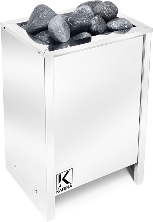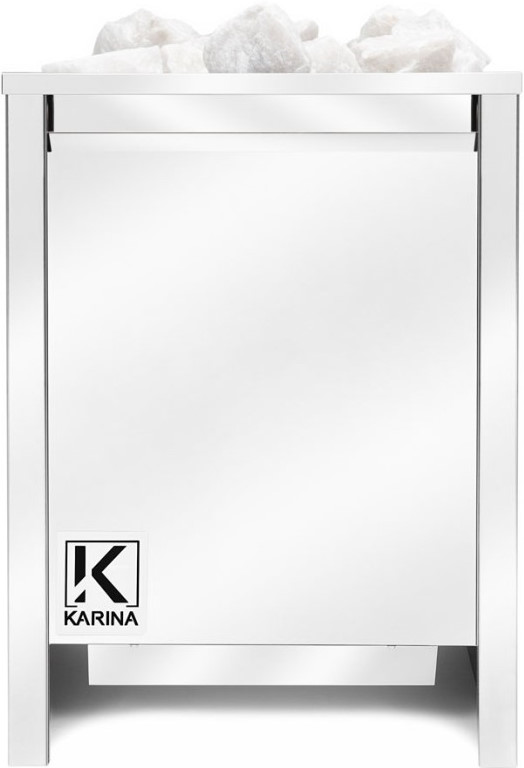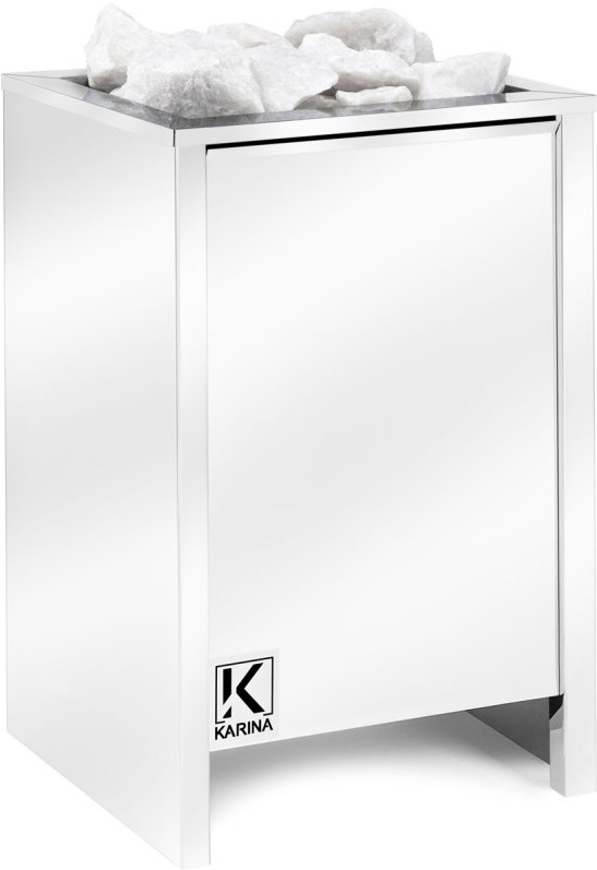 Электрические печи Karina представлены различными по внешнему виду и габаритам моделями: каменки могут быть в виде цилиндрической сетки, стильного прямоугольного кожуха без лишних деталей либо облицованы натуральным камнем. Кроме эстетического вида, облицовка защищает от жесткого инфракрасного излучения внутреннего разогретого электронагревательного блока и увеличивает теплоемкость. Материал отделки представлен плитами камня: амфиболит, змеевик, онего грин или талькохлорит.
