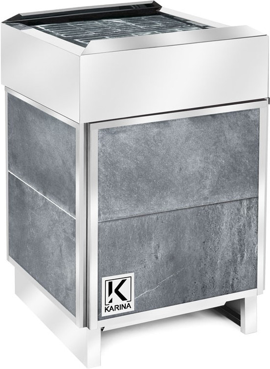 Электрические печи Karina представлены различными по внешнему виду и габаритам моделями: каменки могут быть в виде цилиндрической сетки, стильного прямоугольного кожуха без лишних деталей либо облицованы натуральным камнем. Кроме эстетического вида, облицовка защищает от жесткого инфракрасного излучения внутреннего разогретого электронагревательного блока и увеличивает теплоемкость. Материал отделки представлен плитами камня: амфиболит, змеевик, онего грин или талькохлорит.