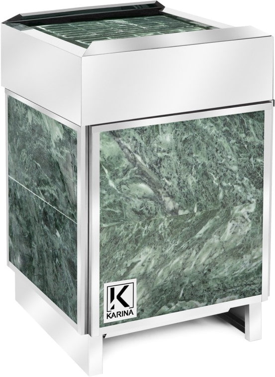 Серия печей Карина Элит представлена моделями с напольным расположением в форме компактного вертикального прямоугольника. Корпус со строгими линиями изготовлен из нержавеющей стали, устойчивой к коррозии. Боковые и фронтальные стенки облицованы натуральным камнем — змеевиком или талькохлоритом толщиной 1 см. Облицовка увеличивает теплоотдачу и теплоемкость устройства, а также позволяет печи вписаться в любой интерьер, придавая ему изысканность.
