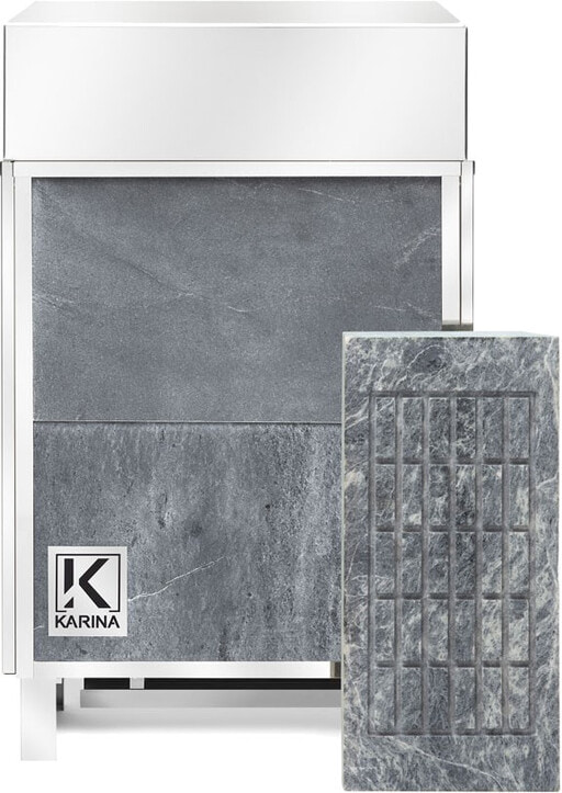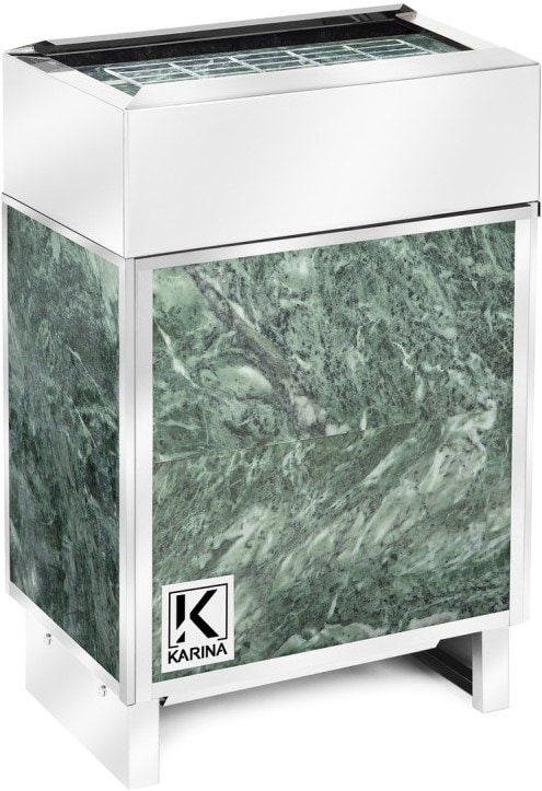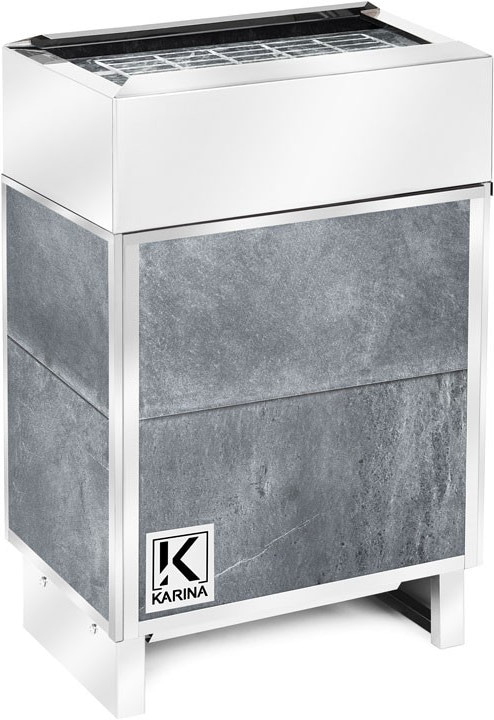 Электрические печи Karina представлены различными по внешнему виду и габаритам моделями: каменки могут быть в виде цилиндрической сетки, стильного прямоугольного кожуха без лишних деталей либо облицованы натуральным камнем. Кроме эстетического вида, облицовка защищает от жесткого инфракрасного излучения внутреннего разогретого электронагревательного блока и увеличивает теплоемкость. Материал отделки представлен плитами камня: амфиболит, змеевик, онего грин или талькохлорит.