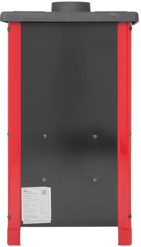Прямое стекло позволит наблюдать за процессом горения. Футеровка топки из шамотного кирпича. На дне топки размещена подвижная колосниковая решетка. Дверца зольного ящика с регулировкой подачи воздуха в топку. Дымоход диаметром 120 мм подключается сверху.