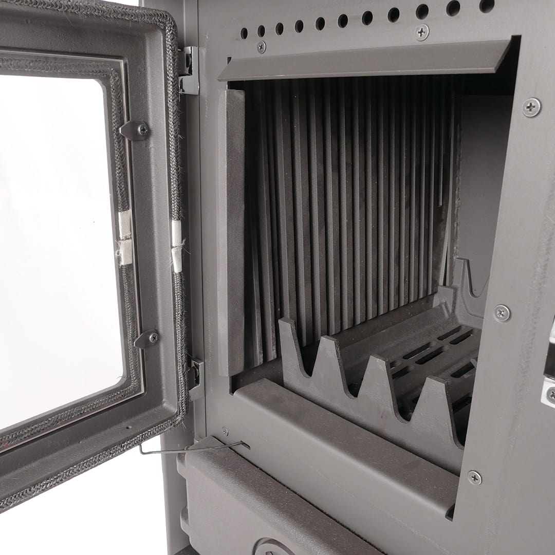 На дне топки расположена подвижная колосниковая решетка. Дверца зольного ящика с регулировкой подачи воздуха в топку. Дымоход диаметром 150 мм подключается сверху или сзади.