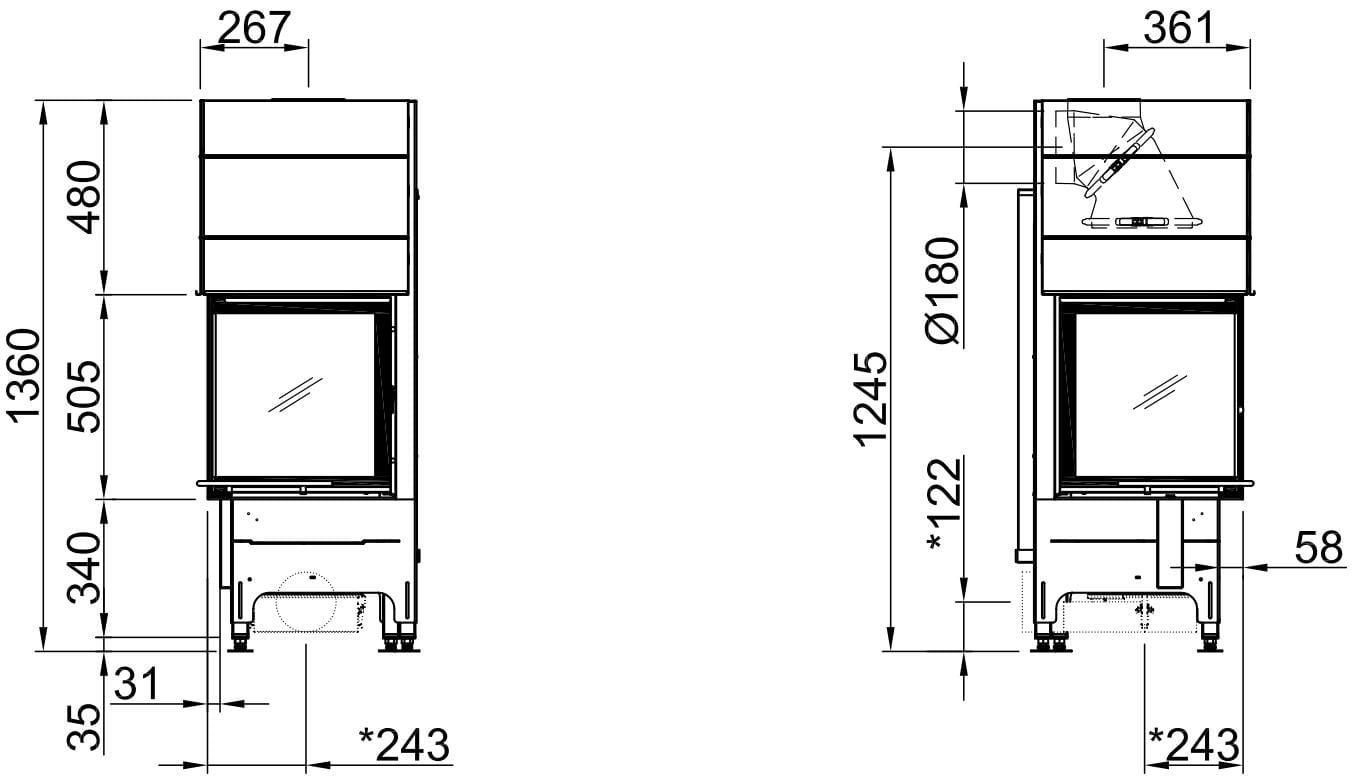 Топочная камера футерована шамотом белого (опционально черного) цвета. Модель оснащена чугунным колосником и зольным ящиком. Топка обладает всеми современными технологиями горения: вторичный дожиг газов и система "Чистое стекло". Очаг с возможностью притока воздуха извне. Для подключения необходим дымоход диаметром 180 мм.