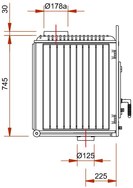 Топочная камера футерована шамотом. Модель оснащена чугунным колосником и зольным ящиком. В топке реализован вторичный дожиг газов. Модель с возможностью притока воздуха извне. Для подключения необходим дымоход диаметром 180 мм. Гарантия — 5 лет.