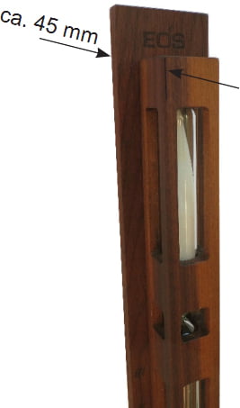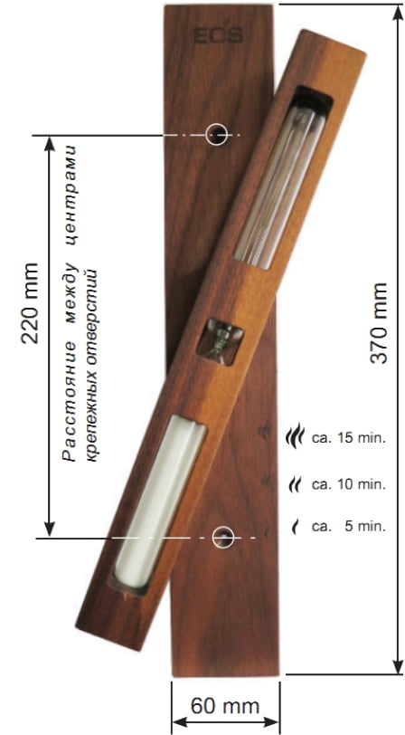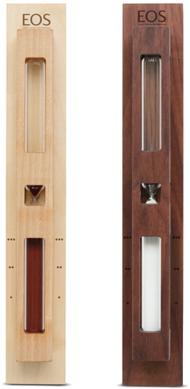 Песочные часы для бани и сауны EOS (Песочные часы для бани и сауны ЕОС) — аксессуар для отслеживания времени, проведенного в бане или сауне, с возможностью возобновления отсчета. Изделие, вручную вырезанное из целого куска ореха или клёна. Шкала с нижней стороны рассчитана на промежуток времени в 15 минут с отметками через каждые 5 минут.