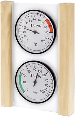 Термогигрометр EOS 180х245 мм (Термогигрометр ЕОС 180х245 мм) — прибор для измерения температуры и относительной влажности непосредственно в парной. Модель с 2 циферблатами диаметром 100 мм в вертикальном корпусе из стекла с деревянными вставками.