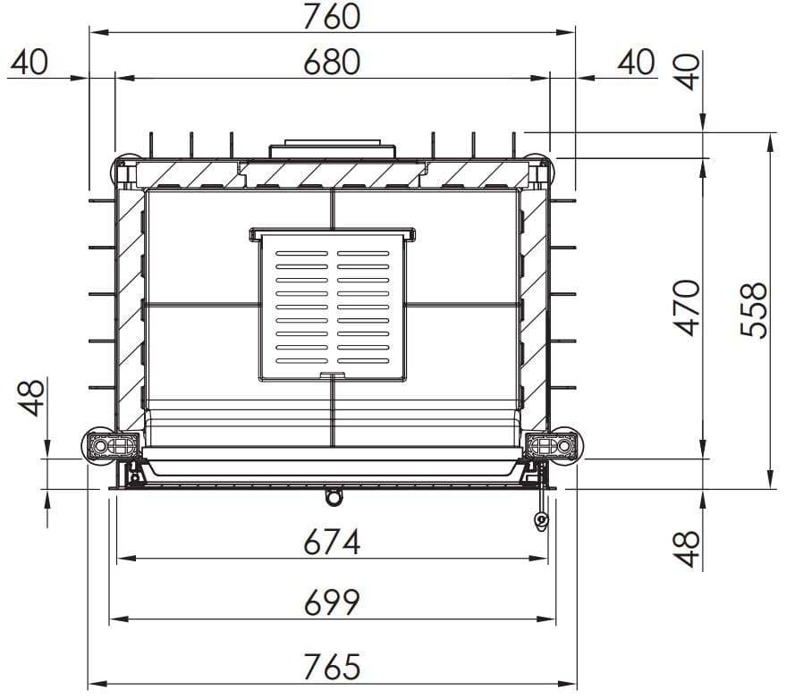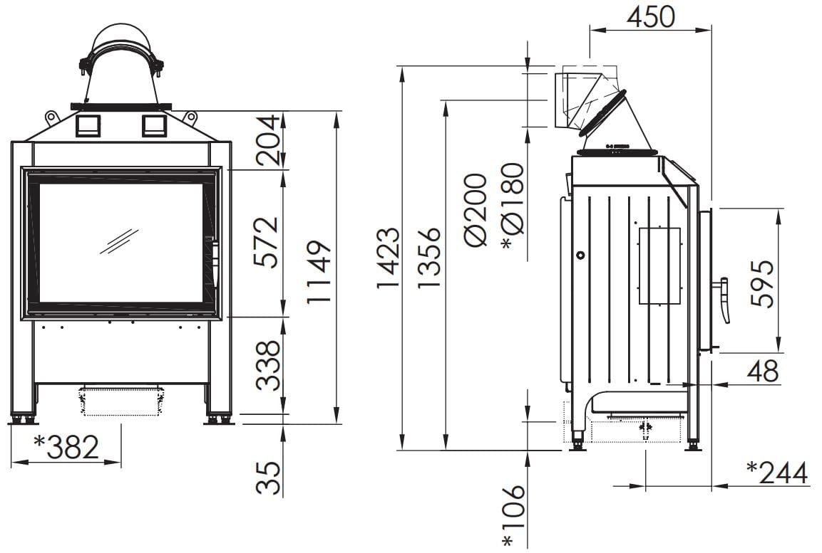 Топочная камера футерована шамотом белого (опционально черного) цвета. Модель оснащена чугунным колосником и зольным ящиком. Топка обладает всеми современными технологиями горения: вторичный дожиг газов и система "Чистое стекло". Очаг с возможностью притока воздуха извне. Для подключения необходим дымоход диаметром 180 мм.