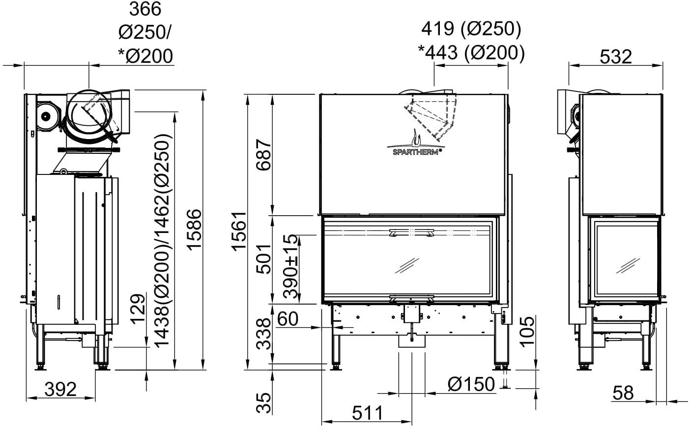 Также все модели Spartherm имеют возможность подвода воздуха на горение извне (из соседнего помещения или улицы). Для этого в конструкции предусмотрен патрубок VLK или SVS. В некоторых моделях адаптер поставляется в комплекте.