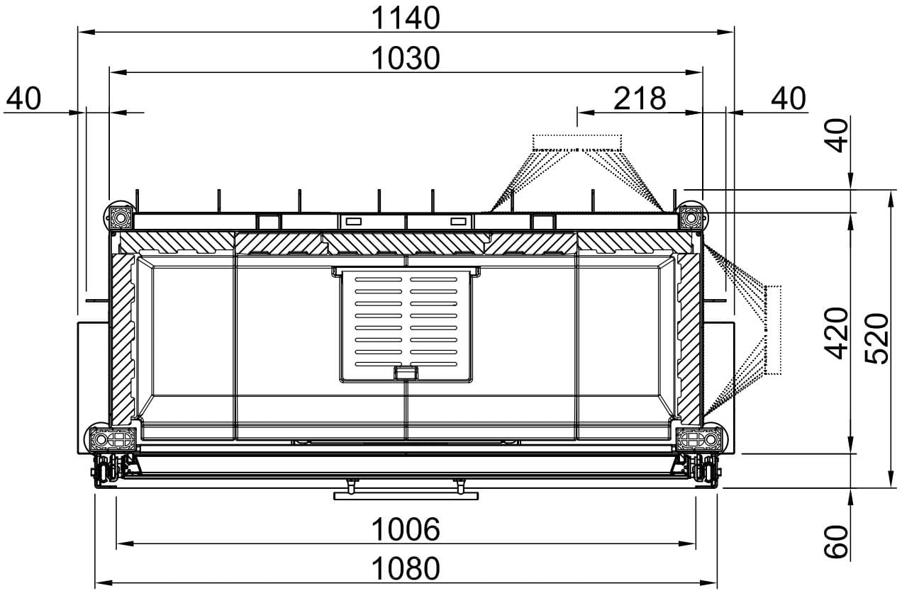 Топочная камера футерована шамотом белого (опционально чёрного) цвета. Модель оснащена чугунным колосником и зольным ящиком. Топка обладает всеми современными технологиями горения: вторичный дожиг газов и система "Чистое стекло". Очаг с возможностью притока воздуха извне. Для подключения необходим дымоход диаметром 250 мм.