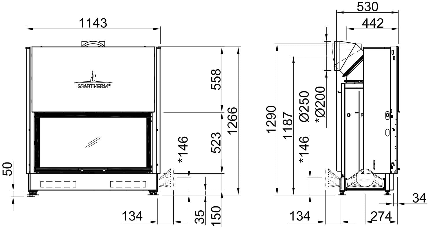 Каминная топка Spartherm Varia Bh (Шпартерм Varia Bh) — это высокоэффективная, современная модель с корпусом из стали. Максимальная мощность равна 13.5 кВт, чего хватает для обогрева помещения в 335 м³. КПД — 78%. У топки прямое жаропрочное стекло, украшенное по периметру шелкографией (отделка Linear 4S). Дверца с подъёмным механизмом. Ширина дверцы — 1006 мм, высота — 523 мм.