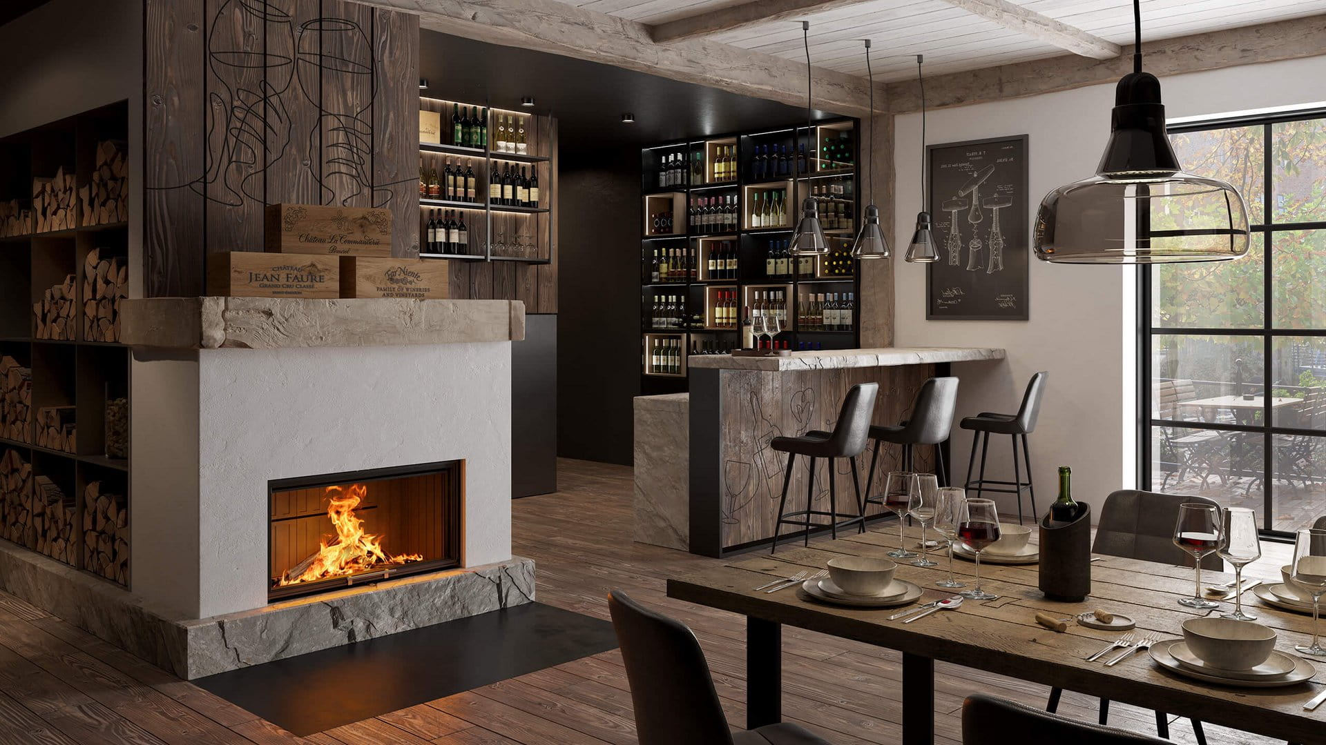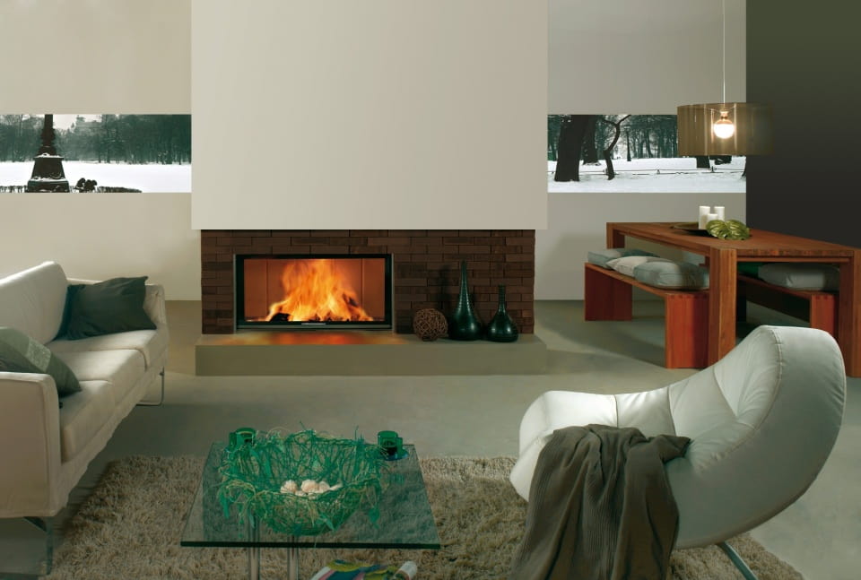 - Arte — модели с вытянутым по высоте стеклом. Вертикальный формат позволит в полной мере насладиться красотой горения. Максимальная мощность топок в диапазоне от 8.3 до 16.9 кВт. Возможны следующие варианты стекла: привычное фронтальное, двухстороннее или же трёхстороннее. Фронтальное стекло трёхсторонних топок может быть широким (такие модели лучше располагать у стены) или узким, но с длинными боковыми стёклами, что отлично подойдёт для завершения межкомнатной перегородки. Дверца всегда оснащена подъёмным механизмом.