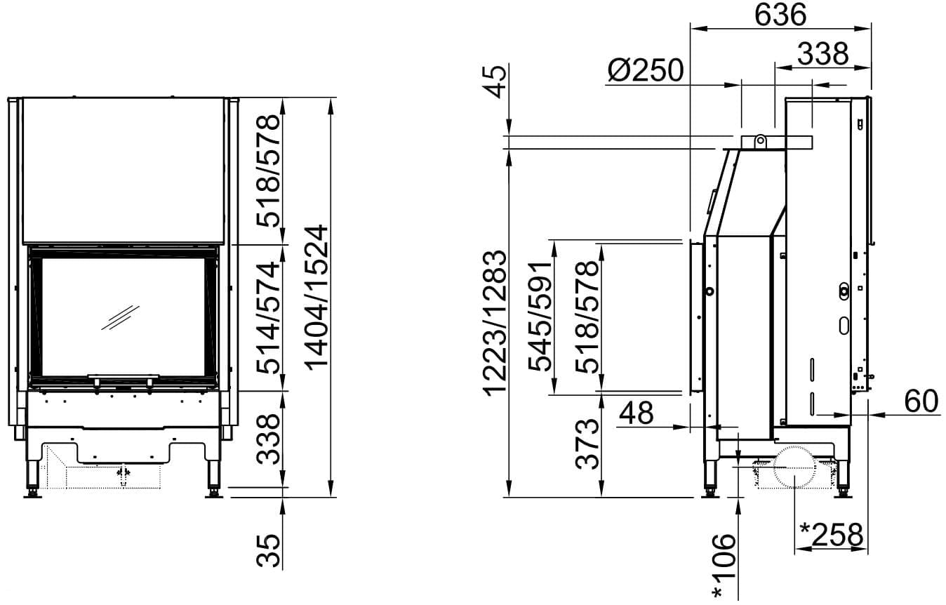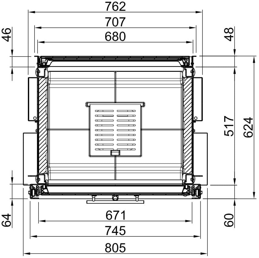 Топочная камера футерована шамотом белого цвета. Модель оснащена чугунным колосником и зольным ящиком. Топка обладает всеми современными технологиями горения: вторичный дожиг газов и система "Чистое стекло". Очаг с возможностью притока воздуха извне. Для подключения необходим дымоход диаметром 250 мм.