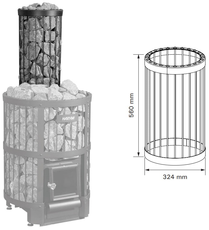 Сетка на трубу Harvia WL300 (Харвия WL300) — стальной элемент цилиндрической формы с вертикальными прутьями, который надевается на дымоходную трубу дровяной печи и заполняется камнями для большей теплоотдачи. Наполненная сетка служит защитой от инфракрасного излучения, а также позволяет значительно сократить безопасное расстояние до дымохода. Масса закладываемых камней составляет примерно 40 кг.