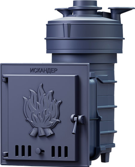 Печь Искандер получила от старших моделей парообразователь прямого нагрева - чугунную каменку имеющую существенную толщину и массу для аккумуляции тепла. Нагреваясь свыше 600С она эффективно нагревает дополнительный заряд, и при попадании воды даёт лёгкий мелкодисперсный пар.