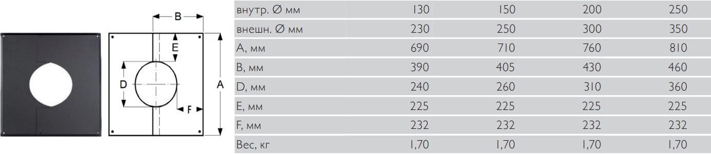 Применяется для декорирования и защиты мест прохода дымоходной трубы через перекрытия и кровлю, а также в качестве дополнительной фиксации оси дымохода. Пластина с ребрами жесткости по периметру выполнена из двух частей, благодаря чему ее можно установить на уже смонтированный дымоход.