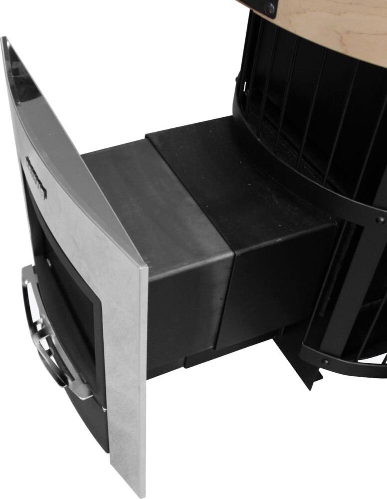 Конструктивно дверца вынесена в смежное с парилкой помещение (предбанник, комната отдыха), откуда и производят обслуживание топочного пространства. Конструкция топочного тоннеля раздвижная, что позволяет устанавливать печь в стену толщиной от 220 до 370 мм. Дверца оборудована жаропрочным стеклом и оснащена стальной декоративной рамкой.