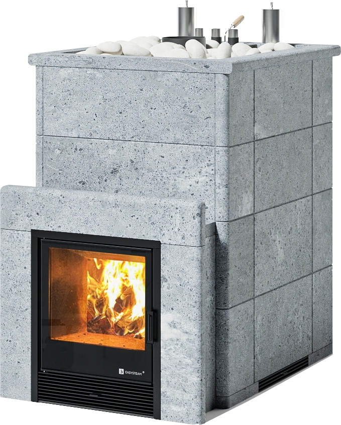 С терморегулирующей задвижкой, позволяющей максимально рационально использовать тепловую энергию и разогревать камни до температур 550-650 °C.