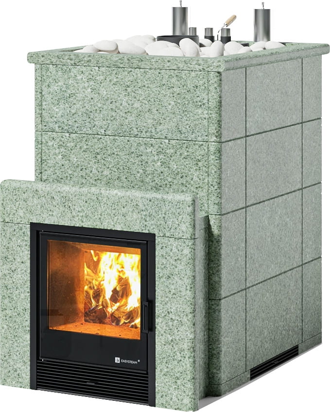 С терморегулирующей задвижкой, позволяющей максимально рационально использовать тепловую энергию и разогревать камни до температур 550-650 °C.