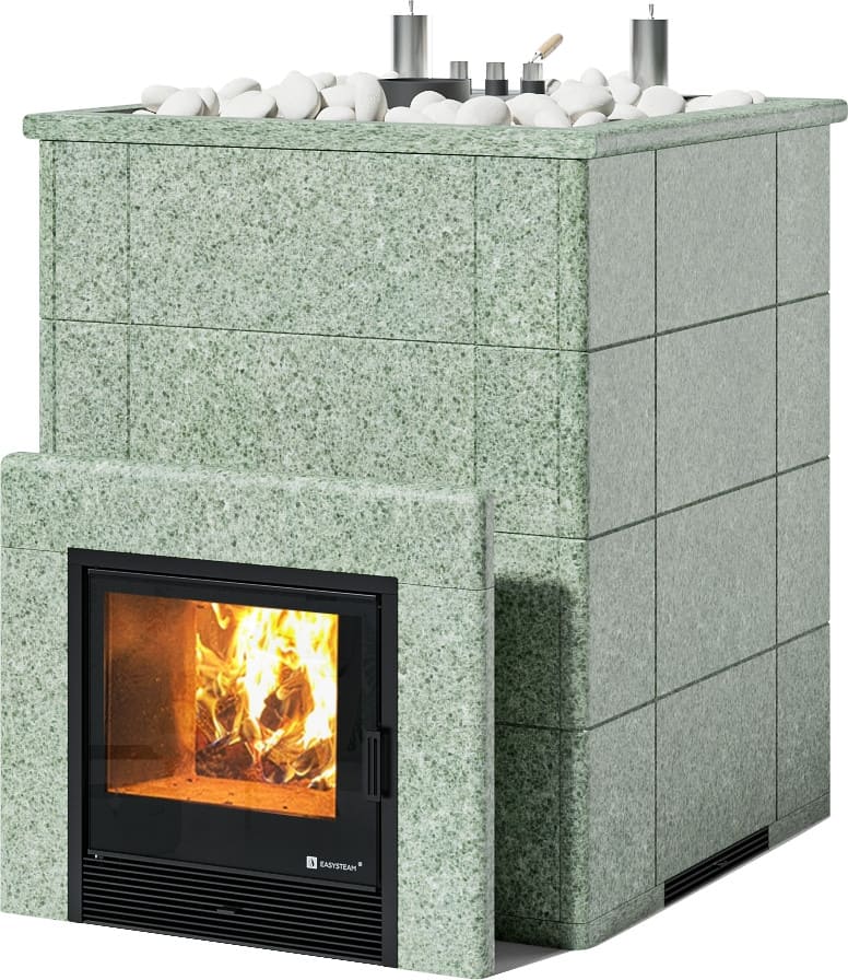 С терморегулирующей задвижкой, позволяющей максимально рационально использовать тепловую энергию и разогревать камни до температур 550-650 °C.