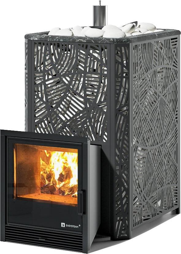 С терморегулирующей задвижкой, позволяющей максимально рационально использовать тепловую энергию и разогревать камни до температур 550-650 °C.