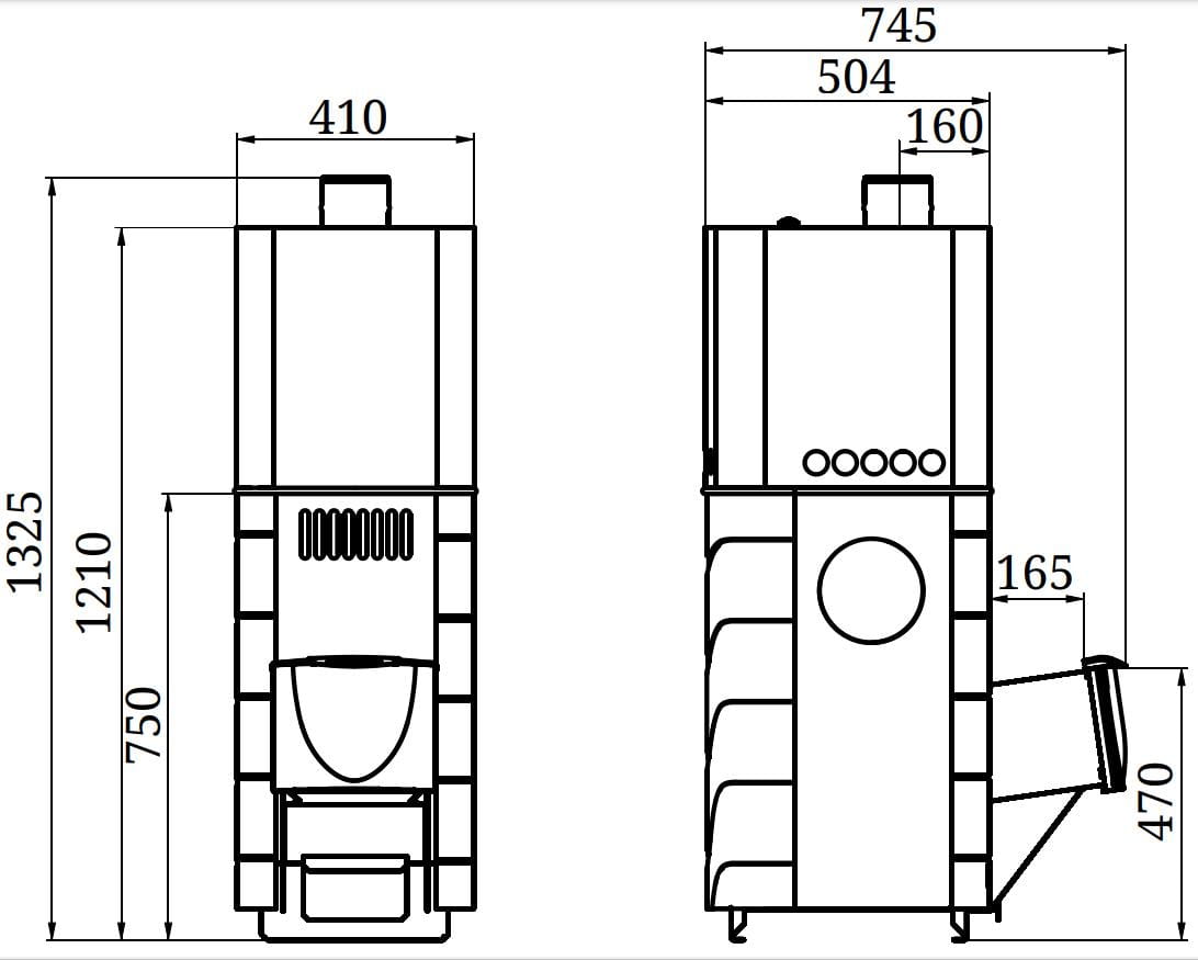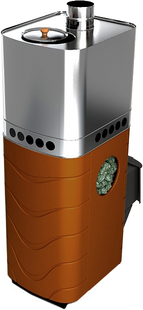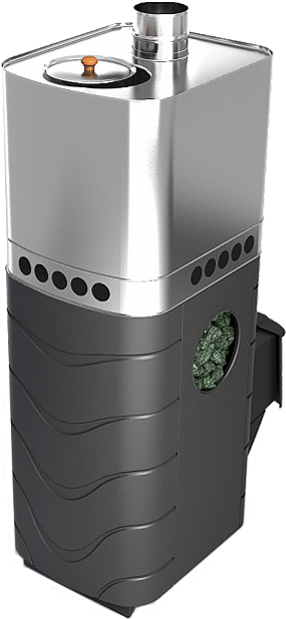 Закрытая круглая каменка, расположенная в топке, вмещает 30 кг камней. Над каменкой установлен встроенный бак нагрева воды объёмом 60 литров. Кожух печи вытянутой прямоугольной формы, нижняя часть окрашивается в цвет антрацит или терракотовый. Все печи топятся из смежного помещения (предбанник, комната отдыха), откуда и производят обслуживание топочного пространства. Возможны два варианта дверцы: