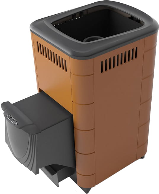 Кожух печи прямоугольной формы со скошенными углами окрашен в терракотовый цвет. Модель комплектуется дверцей антрацит. Дверца вынесена в смежное с парилкой помещение (предбанник, комната отдыха), откуда и производят обслуживание топочного пространства.