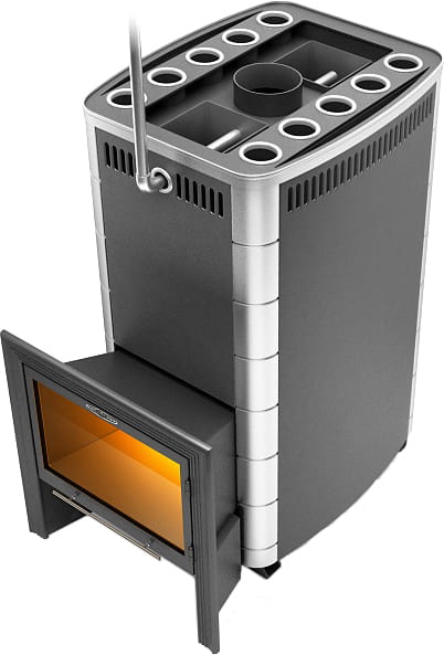 Дровяная печь для бани ТМФ Гекла Inox БСЭ ЗК Иллюминатор (TMF Гекла Inox БСЭ ЗК Иллюминатор) — модель, предназначенная для создания режима финской сауны в парных объёмом до 50 м³. Закрытая, прогреваемая со всех сторон каменка вмещает 70 кг камней. Слева и справа от каменки расположен десятицилиндровый теплообменник, значительно сокращающий время нагрева парной.