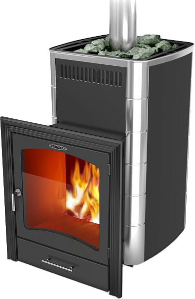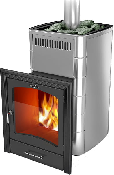 Дверца с топливным каналом вынесена в смежное с парилкой помещение, откуда и производят обслуживание топочного пространства.