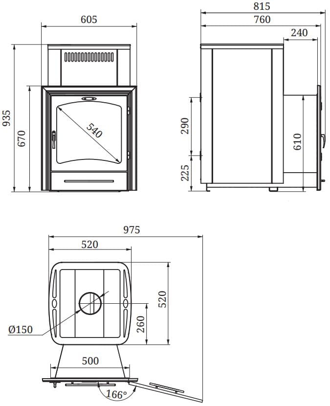 Кожух печи прямоугольной формы может быть окрашен в цвет антрацит и украшен элементами из нержавеющей стали или же полностью выполнен из нержавейки. Модель комплектуется дверцей с рамкой цвета антрацит и большим экраном: жаростойкое стекло Schott Robax диагональю 54 см. В верхней части двери смонтирована щель самоочистки стекла от оседающей сажи.