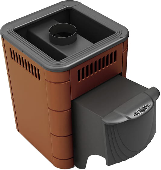Кожух печи прямоугольной формы может быть окрашен в терракотовый цвет или в цвет антрацит со вставками из нержавеющей стали. Модель комплектуется дверцей антрацит. Дверца вынесена в смежное с парилкой помещение (предбанник, комната отдыха), откуда и производят обслуживание топочного пространства.