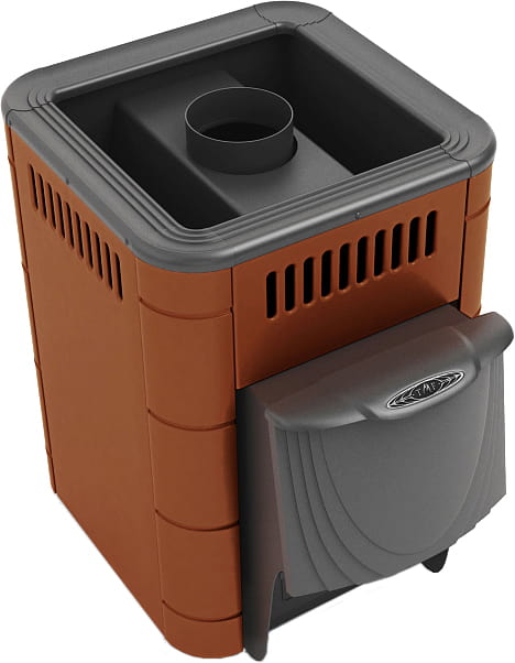 Кожух печи прямоугольной формы может быть окрашен в терракотовый цвет или в цвет антрацит со вставками из нержавеющей стали. Дверца с коротким топливным каналом, обслуживание топочного пространства происходит из парного помещения.