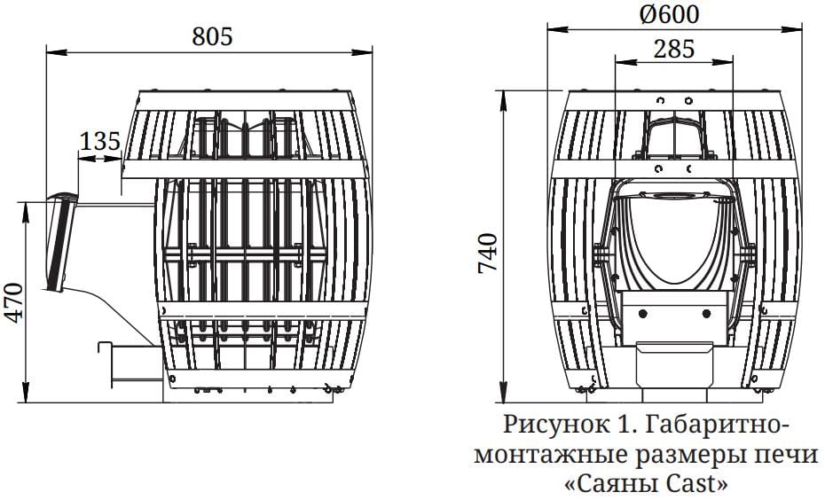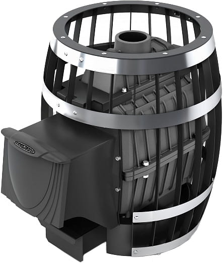 Кожух печи исполнен в виде сетки-бочки. Модель комплектуется дверцей антрацит. Дверца вынесена в смежное с парилкой помещение (предбанник, комната отдыха), откуда и производят обслуживание топочного пространства.