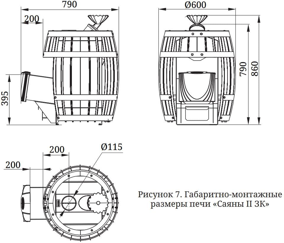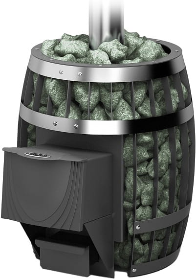 Кожух печи исполнен в виде сетки-бочки. Модель комплектуется дверцей с антрацит. Дверца вынесена в смежное с парилкой помещение (предбанник, комната отдыха), откуда и производят обслуживание топочного пространства.