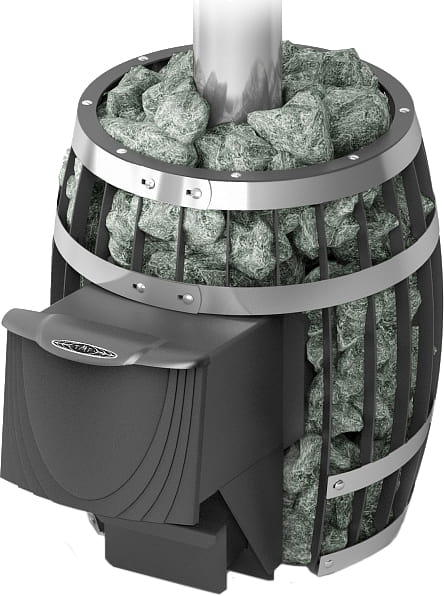 Кожух печи исполнен в виде сетки-бочки. Модель комплектуется дверцей антрацит. Дверца вынесена в смежное с парилкой помещение (предбанник, комната отдыха), откуда и производят обслуживание топочного пространства.