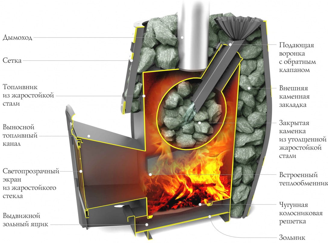 - Закрытой, вместимостью 33 кг. Вода сначала подаётся в самый центр каменки с помощью воронки, снабжённой обратным клапаном. В ней вода преобразовывается в пар и попадает в открытую каменку.