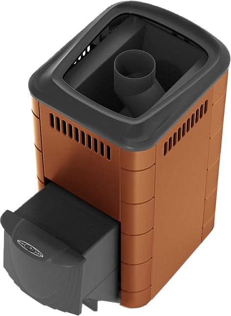 Кожух печи прямоугольной формы со скошенными углами окрашен в терракотовый цвет. Модель комплектуется дверцей антрацит. Дверца вынесена в смежное с парилкой помещение (предбанник, комната отдыха), откуда и производят обслуживание топочного пространства.